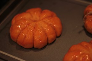 Decorate like a pumpkin and glaze before putting them into the oven