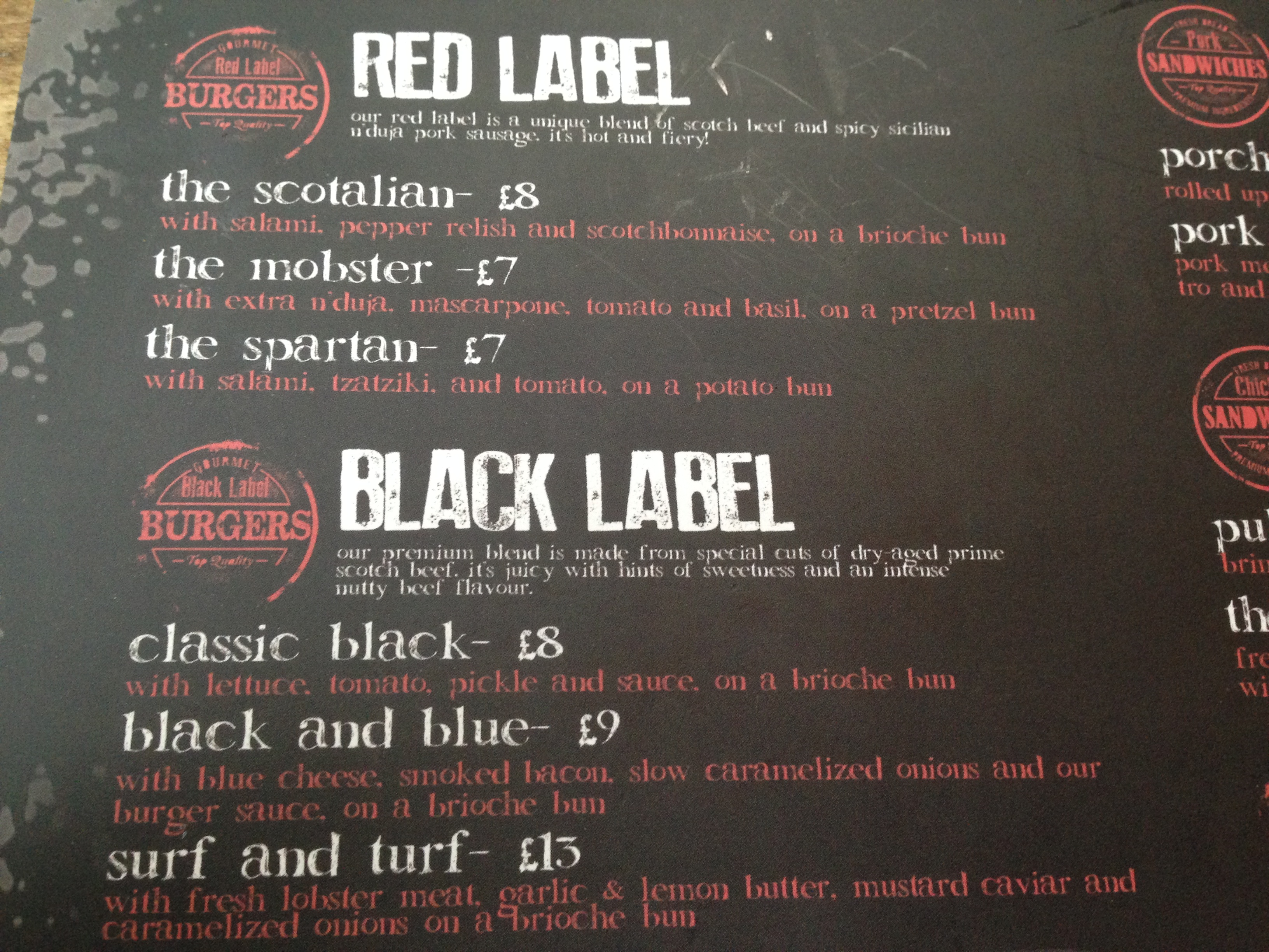 I noticed on the menu that several items had stickers placed next to them to indicate that they weren’t available at that time such as the poutine and the ice cream selection. I decided to go for the ‘fullhouse’ burger, but was quickly informed that there was no pastrami or brisket available either. I was told I could have the fullhouse without the brisket, but what would be the point in that? We decided to go for the black label ‘classic black’ and the ‘Scotalian’ instead.