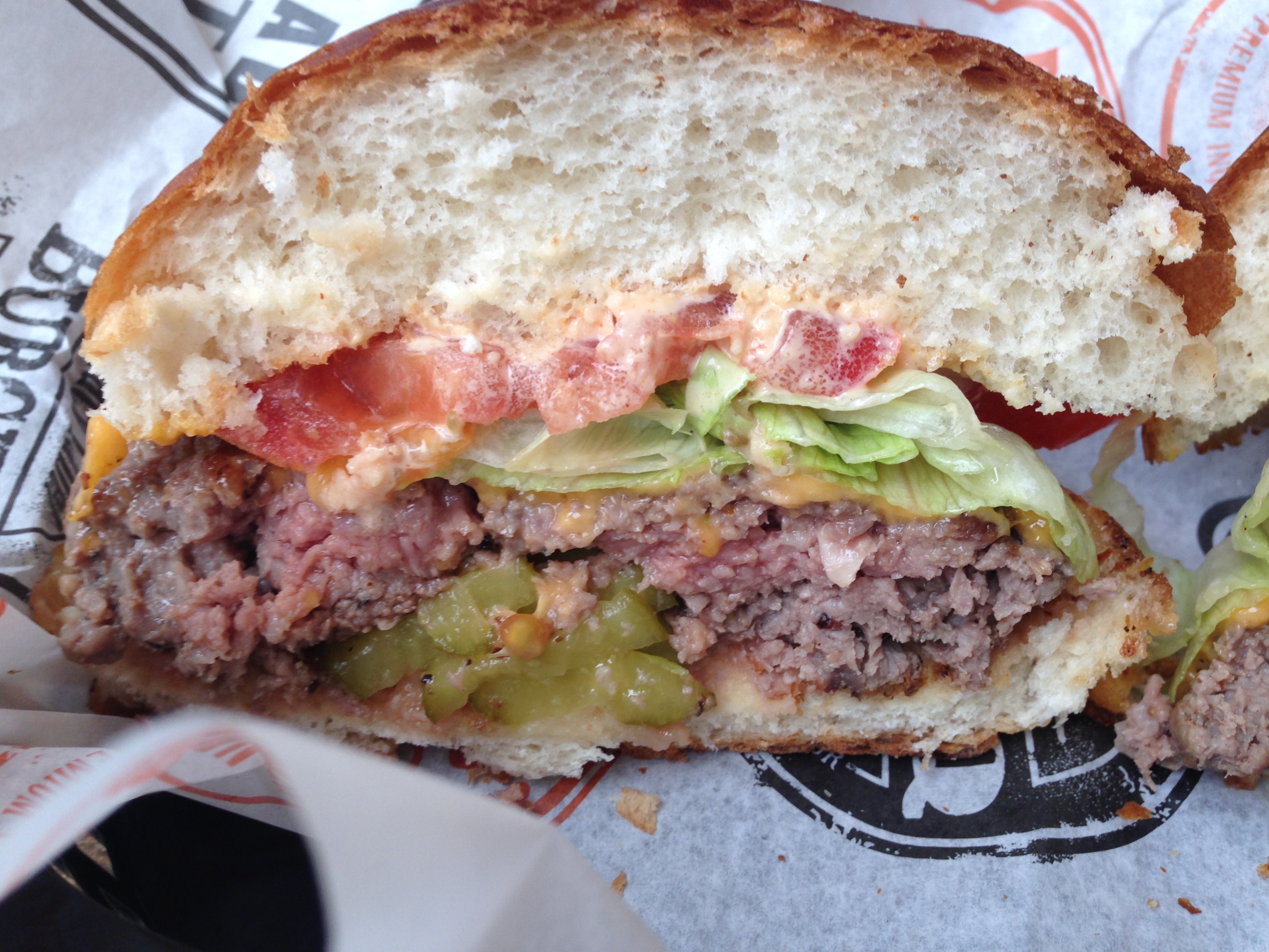 Again, the bun was nicely toasted and was very light. The bottom did start to give out halfway through this one; however, the patty was much bigger than the one that made up the first burger.