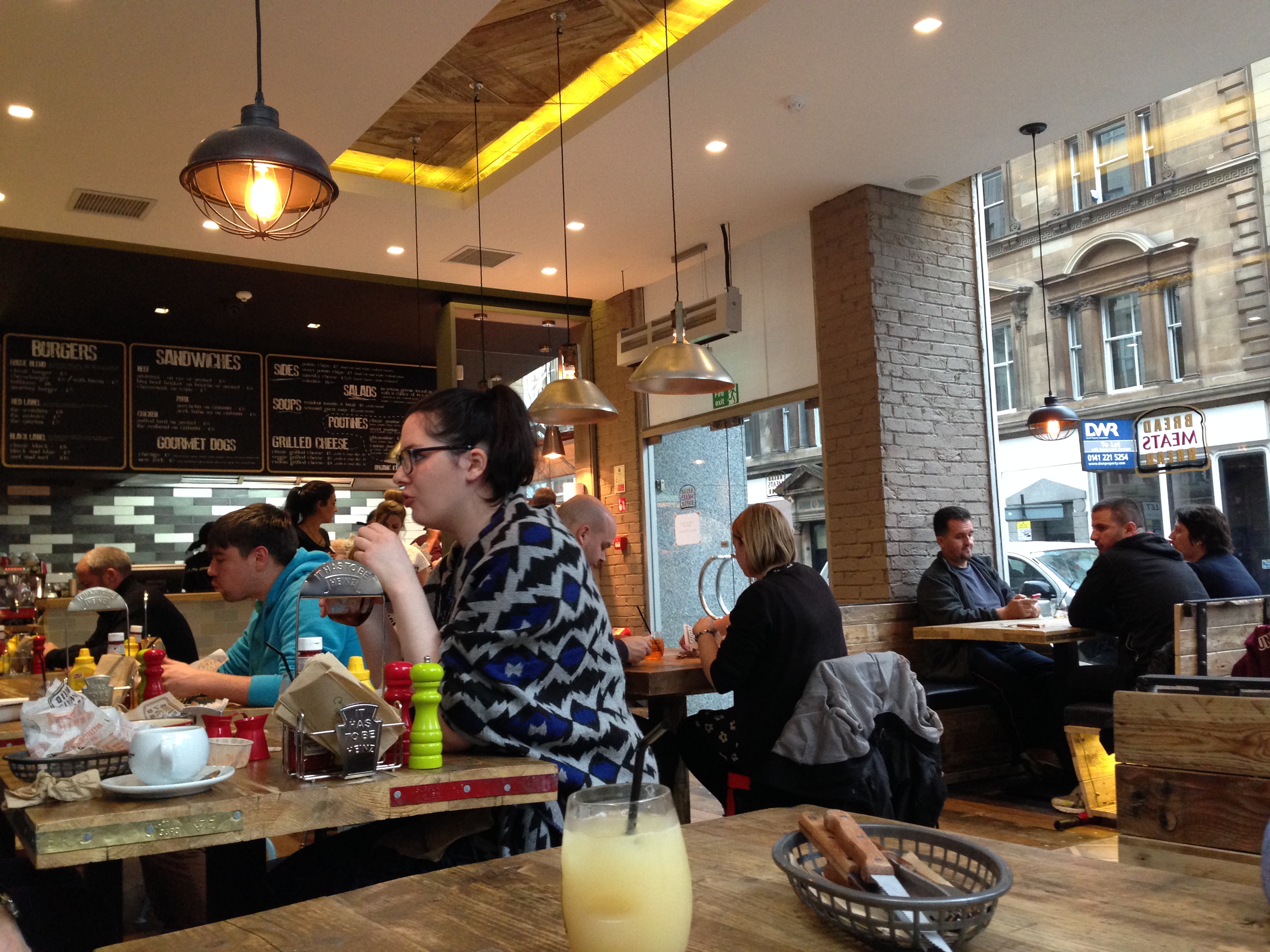 We (three) were at the ‘bar’ right in the corner looking out at the junction of hope street, girl with purpleish hair and girl with red hair were with me?